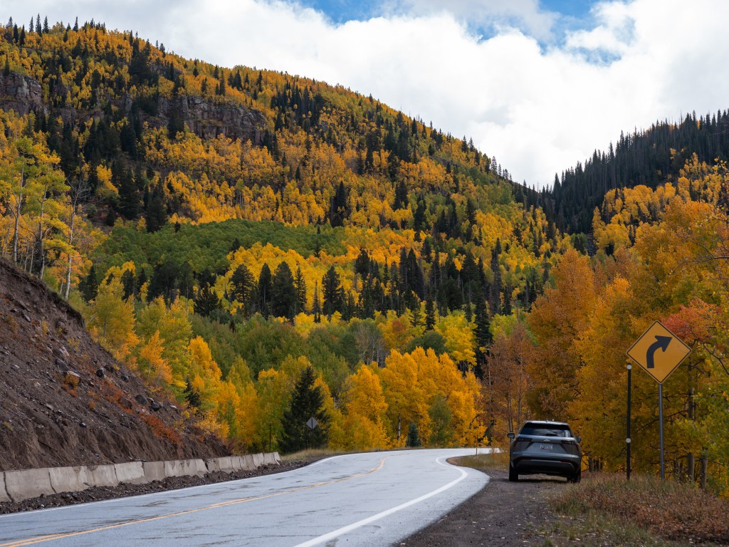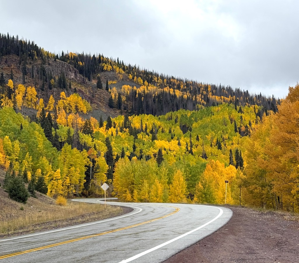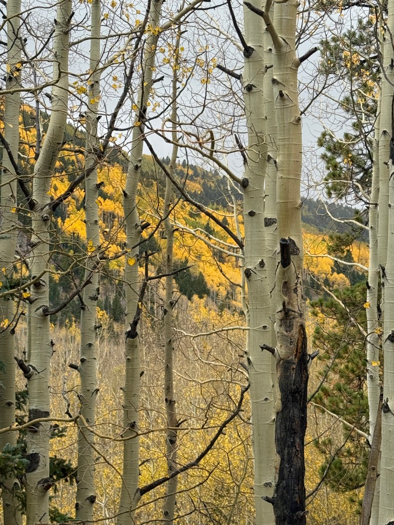 The road peaked at 10,000 feet and at that height there were no yellow trees. They had not been invited to such lofty heights. But drop a thousand feet, and there they were, as big as day.