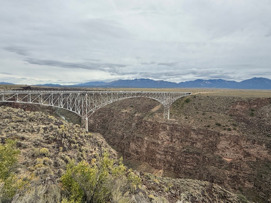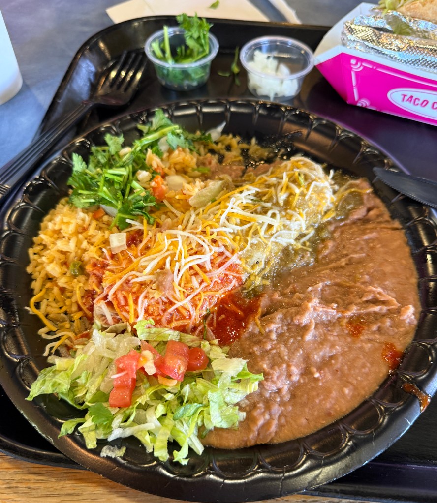 Seeing the city start to end and a vast plain start to appear, i though some food would be a good idea. I passed a taco joint with lots of cars parked in front of it. This was my divine clue and i walked in and discovered that my polarized sunglasses completely zeeted out the LED menu display making it totally black. Fortunately there were backup menus and i ordered a number 38. I was asked if i wanted my enchilada to be green, red, or chris. I asked if chris meant ‘christmas’ which it did (see? i did my homework) and so i got a red and green enchilada. When i sat down, the lumbering person behind the counter who took my order prevented entry of a homeless person and his dog in what i bet was a daily dance of theirs and probably the reason why he was a lumbering counter person. My chris enchilada, beans, and rice were fantastic and off i went in search of the singing road. I think i am gonna like the next 10 days. I will be back to ABQ at the end of the trip and so left the city behind without any investigation.